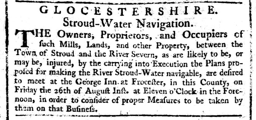 Opponents made clear their determination to obstruct the scheme. Advertisements were placed in the Gloucester Journal inviting those likely to be affected by the scheme to meet together and discuss their responses to the proposed scheme. Some landowners felt the purchase prices offered for their land were inadequate, and some twenty three mill owners below Stroud were concerned about losing water. They presented a petition to Parliament stating, there are upon the said river between Wallbridge and Framiload forty two pairs of stocks, sixteen gigg mills and seven napping mills employed in the woollen manufactory, sixteen pairs of millstones employed in grinding corn and an iron wire mill, a steel wire mill, six pair of rolls for rolling iron, a slitting mill and a rounding hammer for braziers rods employed in the manufacture of iron, all of which are wrought by wheels turned by the water of the said river for which purpose a great force and weight of water is necessary … the said mills upon a moderate calculation afford employment for 5000, and thereby give bread to above 9000 persons and during the summer months in general have not a sufficient supply of water to keep them going more than two thirds and sometimes not more than half of their time; and should the proposed navigation take place it would deprive the petitioners of a great quantity of water, & render the said mills of little use … and the petitioners apprehend that the advantages to arise from the proposed navigation will not be adequate to the injury thereby done to private property … and … will be highly injurious to the woollen & iron manufactures now carried on within the said county to a very considerable extent; and therefore praying that the petitioners may be heard by their counsel, against the said Bill and that the same may not pass into a Law or that they may have such other relief in the promises as to the House shall soon meet.