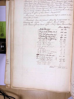 Samuel Smith submitted four hundred and seventy-seven pounds one shilling and eightpence halfpenny balance of tonnage, wharfage, and rent from 1st October to the 31st March after deduction of rent of roads and lands, the maintenance of the fire engine, repairs of the canal,, locks and buildings and for land , clerks salaries.