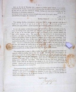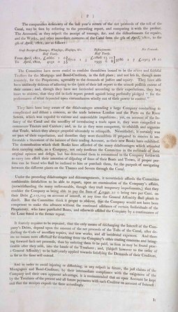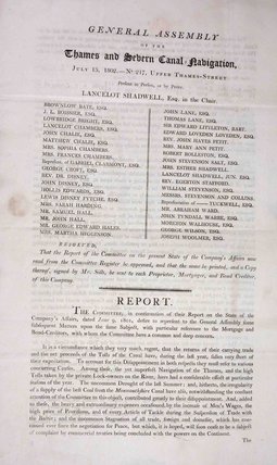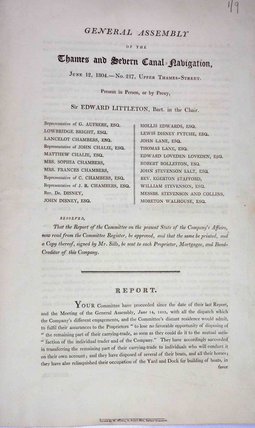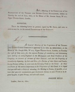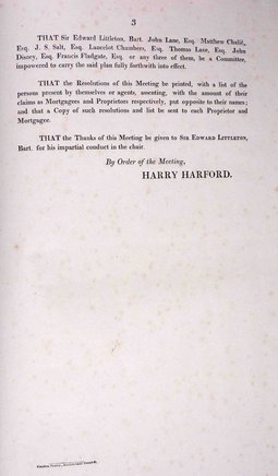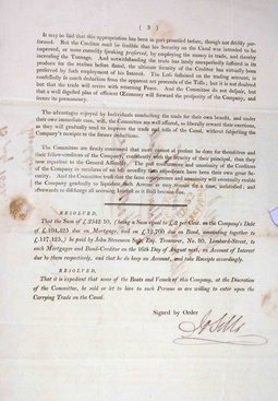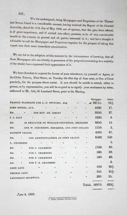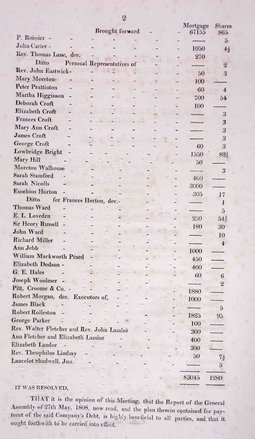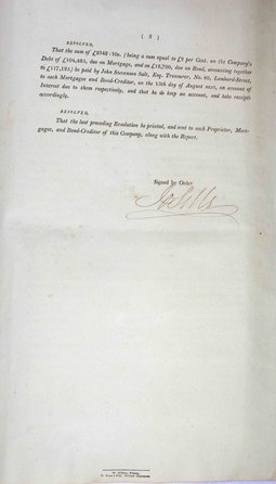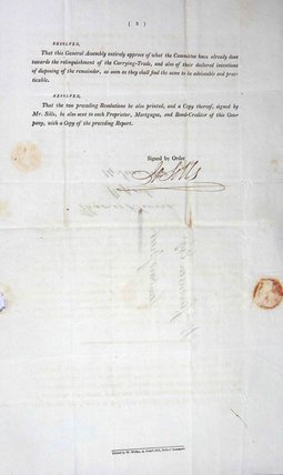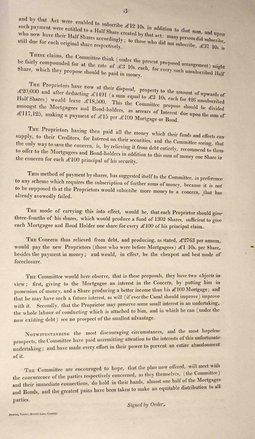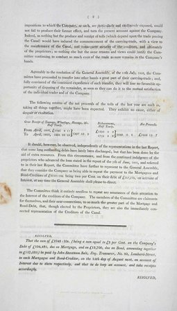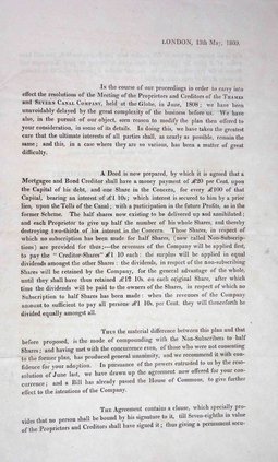 Printed notice of and printed minutes of a meeting of Proprietors and Mortgagees on 21 Jun 1808 that agreed the Committee’s plan to reorganise the Company’s capital be carried into effect, and printed list of the financial position of each individual.