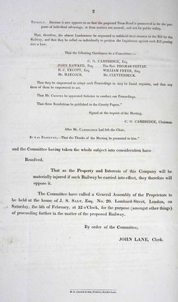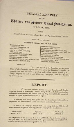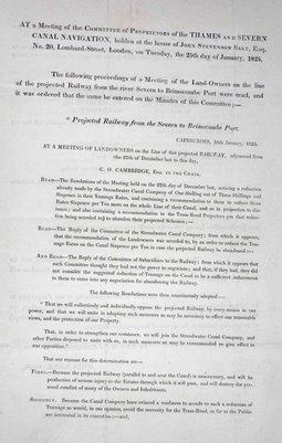 Printed report of a meeting of the Committee at which they agreed to oppose a projected railway from the River Severn to Brimscombe Port.