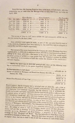 Having property at their disposal amounting upwards of £20,000 and after deducting £1491 (a sum equal to £3 10s each for 426 unsubscribed Half Shares) would leave £18,500. This should be divided amongst the Mortgagees and Bond holders as arrears of interest due upon the sum of £117,125 making a payment of £15 per £100 Mortgage or Bond.