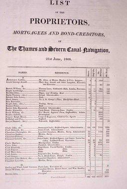 List of the Proprietors Mortgagees and Bond-Creditors of the Thames and Severn Canal Navigation 21 June 1808 showing names; No. of shares; Half shares; On Mortgage; On bond; Non subscribers and showing shares not paid for. With penned ticks against many names.