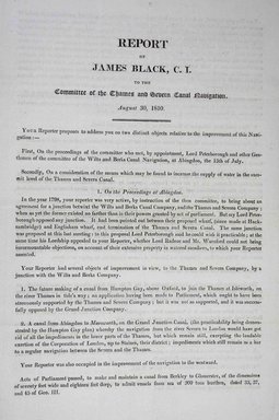 Printed report by James Black about a proposed canal linking the Wilts & Berks Canal with the Thames & Severn Canal, and about attempts to increase the supply of water to the summit level of the Thames & Severn Canal.
